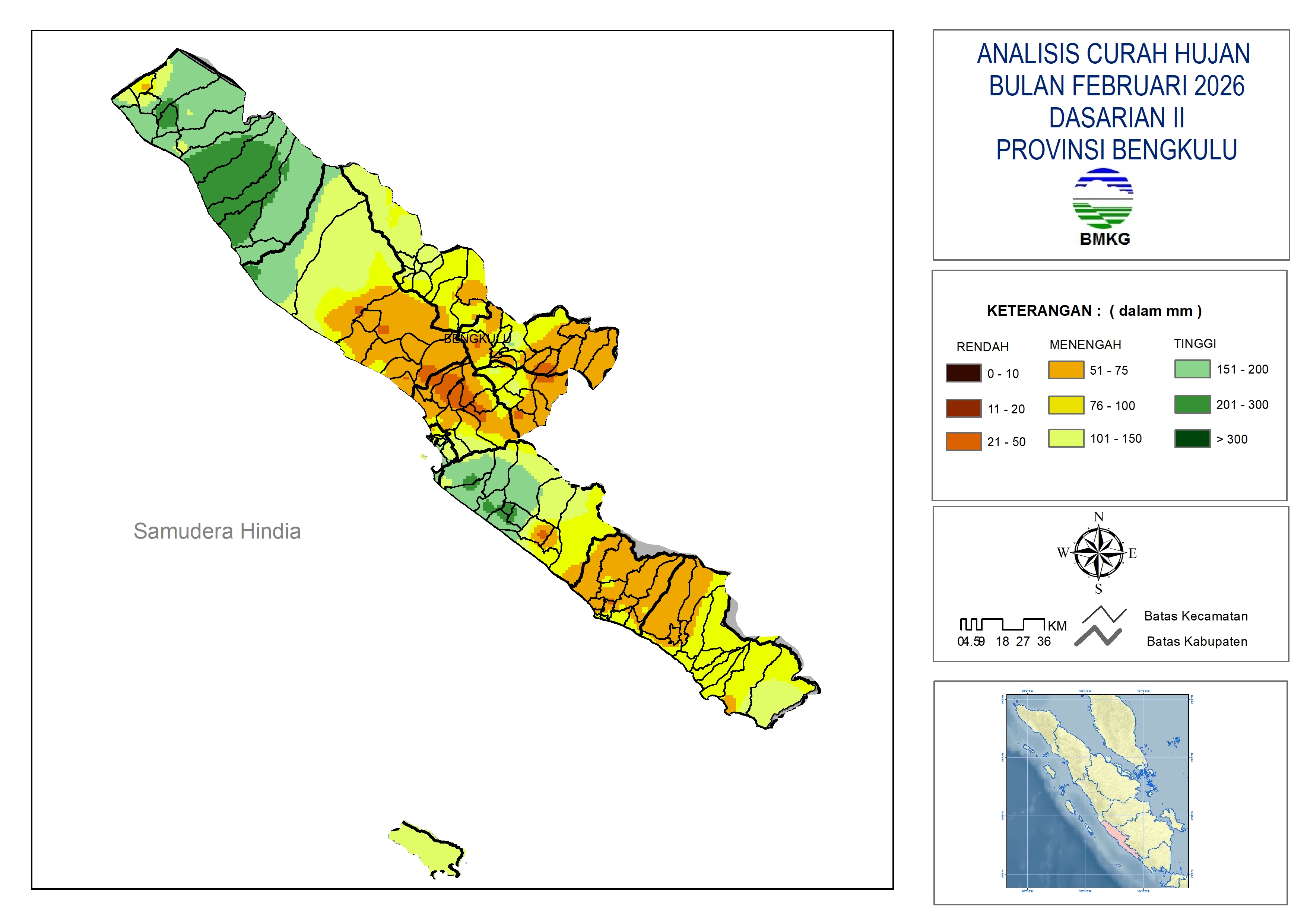 - Curah hujan pada dasarian II bulan Februari 2026, di wilayah Provinsi Bengkulu didominasi kategori Tinggi (151-300 mm) hingga Menengah (51-150 mm), kecuali sebagian kecil wilayah di Kabupaten Rejang Lebong, Kepahiang, Bengkulu Utara, Seluma, Bengkulu Selatan, dan sebagian wilayah di Kabupaten Bengkulu Tengah yang berada pada kategori Rendah (0-50 mm).