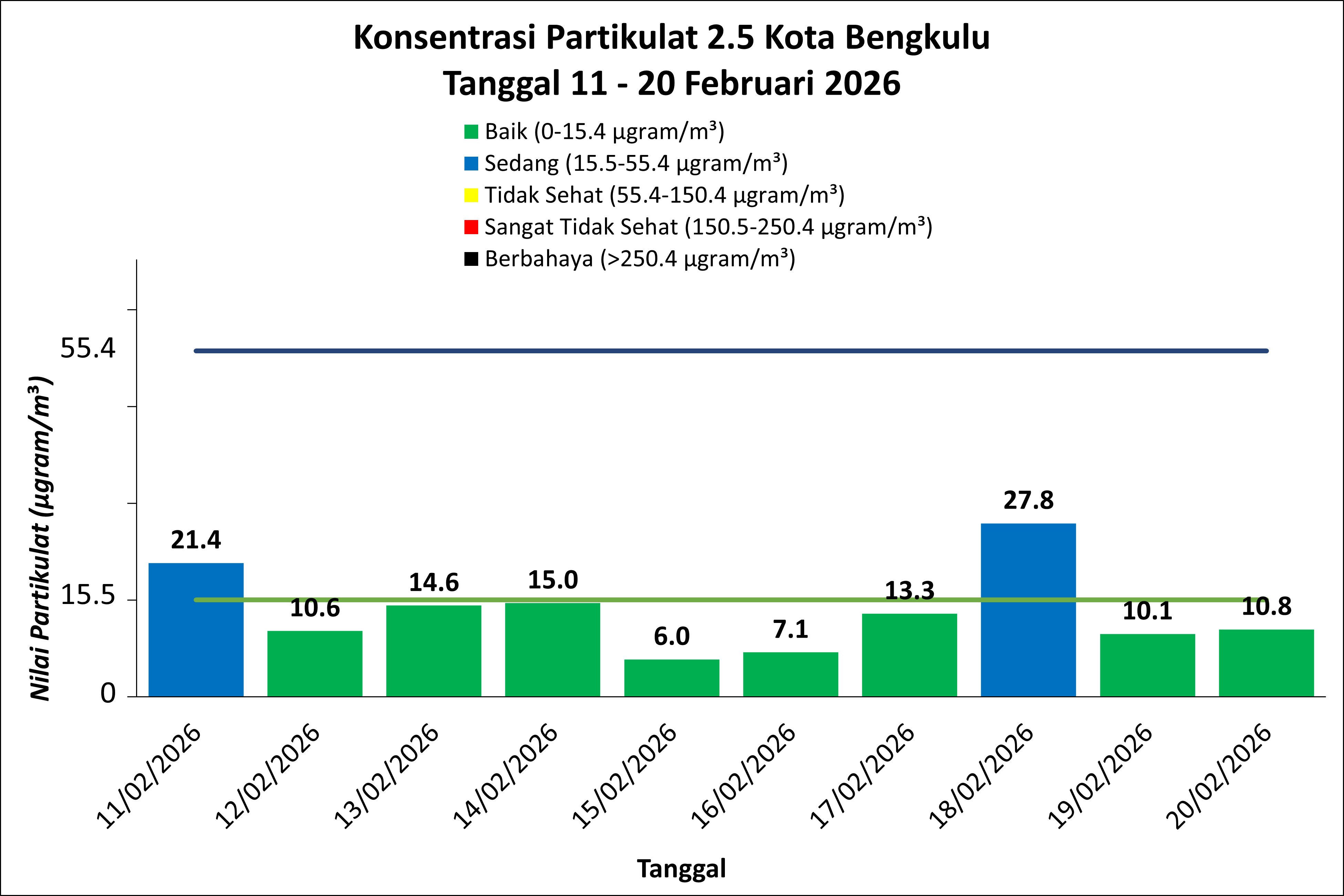 - Selama periode 11 – 20 Februari 2026, kualitas udara di Kota Bengkulu tergolong baik.