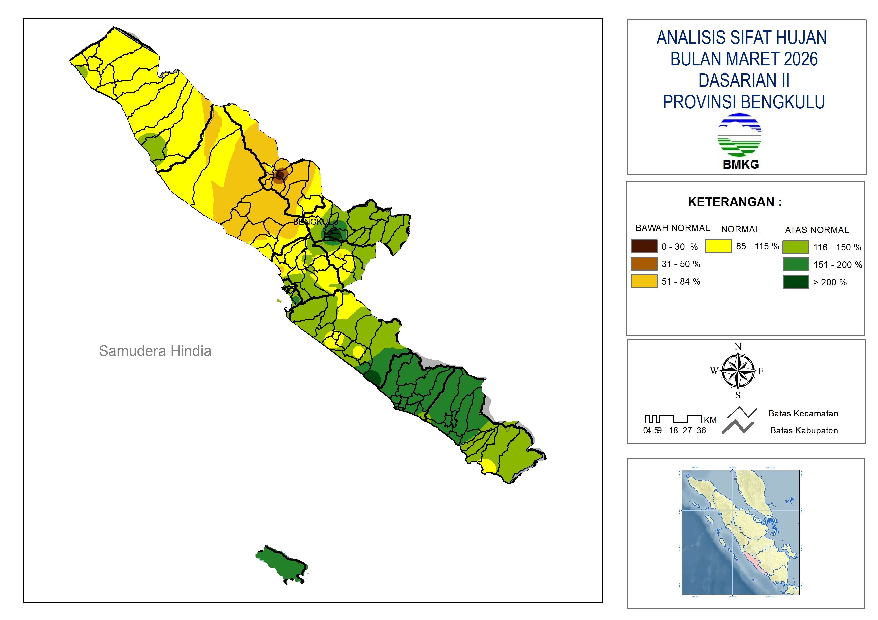 - Sifat hujan pada dasarian II bulan Maret 2026, di wilayah Provinsi Bengkulu pada umumnya berada pada kategori Normal (85-115%), hingga Atas Normal (116- >200%), kecuali sebagian wilayah Kabupaten Bengkulu Utara, Lebong, sebagian kecil wilayah Kabupaten Mukomuko, dan Bengkulu Tengah yang berada pada kategori Bawah Normal (<85%)