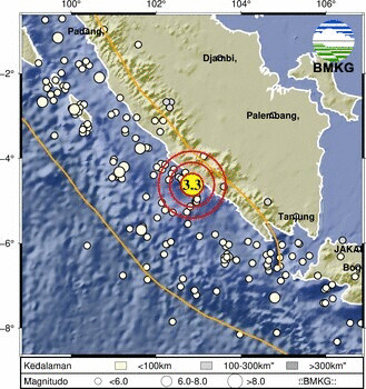 Info Gempa Mag:3.3, 12-Jan-26 08:13:37 WIB, Lok: 4.62 LS – 102.84 BT (20 km Barat Daya BENGKULUSELATAN), Kedlmn: 55 km ::BMKG