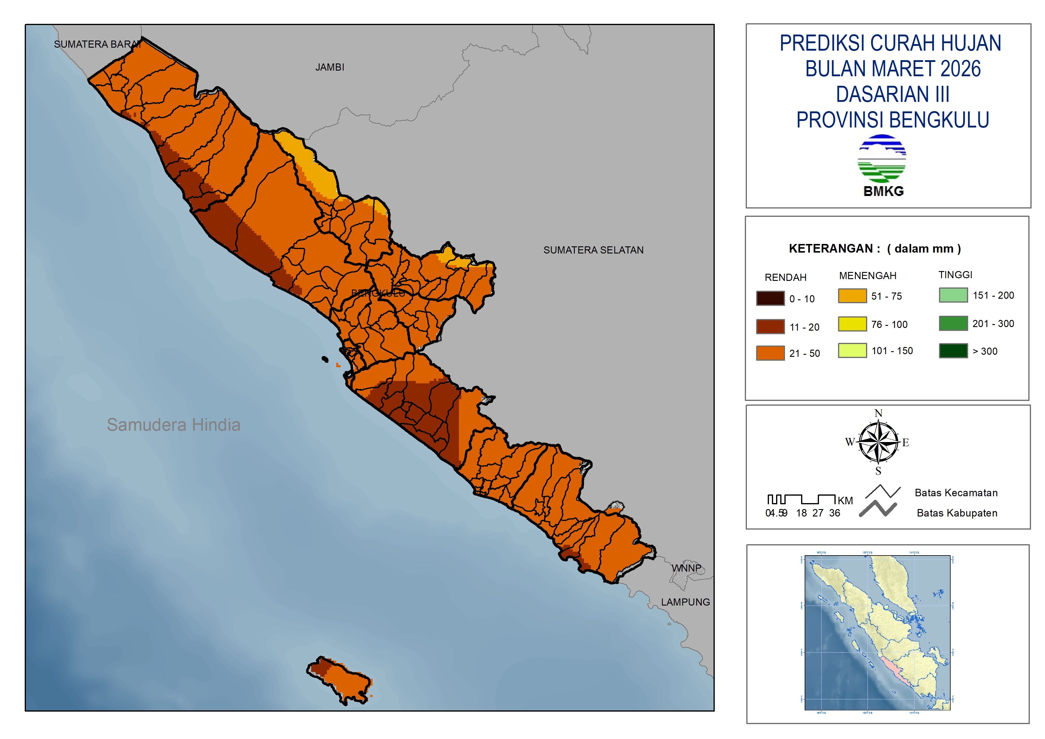 Curah hujan di seluruh Provinsi Bengkulu secara umum diprediksi berada pada kategori Rendah hingga Menengah berkisar antara 0 hingga 75 milimeter.