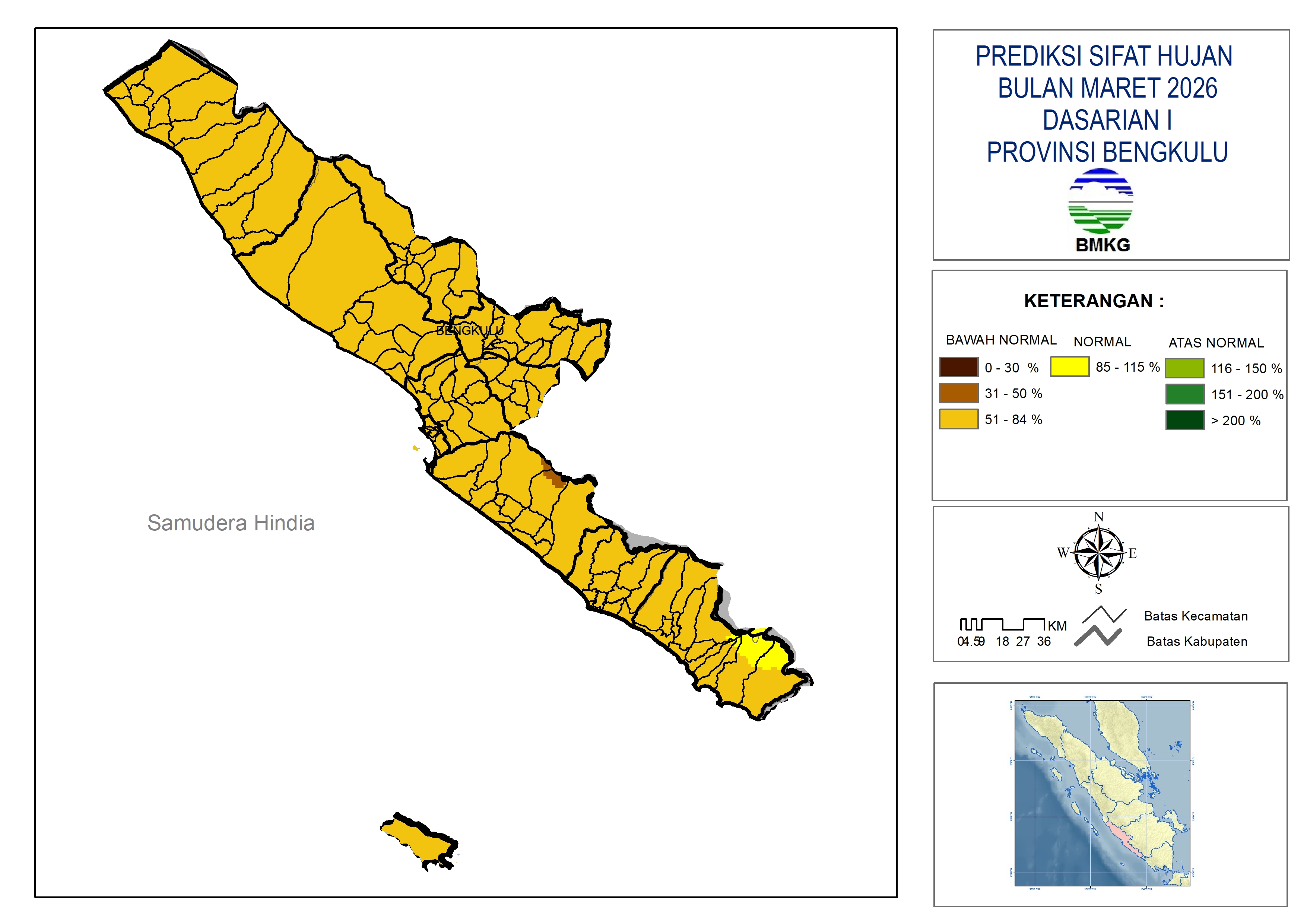 sifat hujan di seluruh Provinsi Bengkulu secara umum diprediksi berada pada kategori Bawah Normal 0-84%).