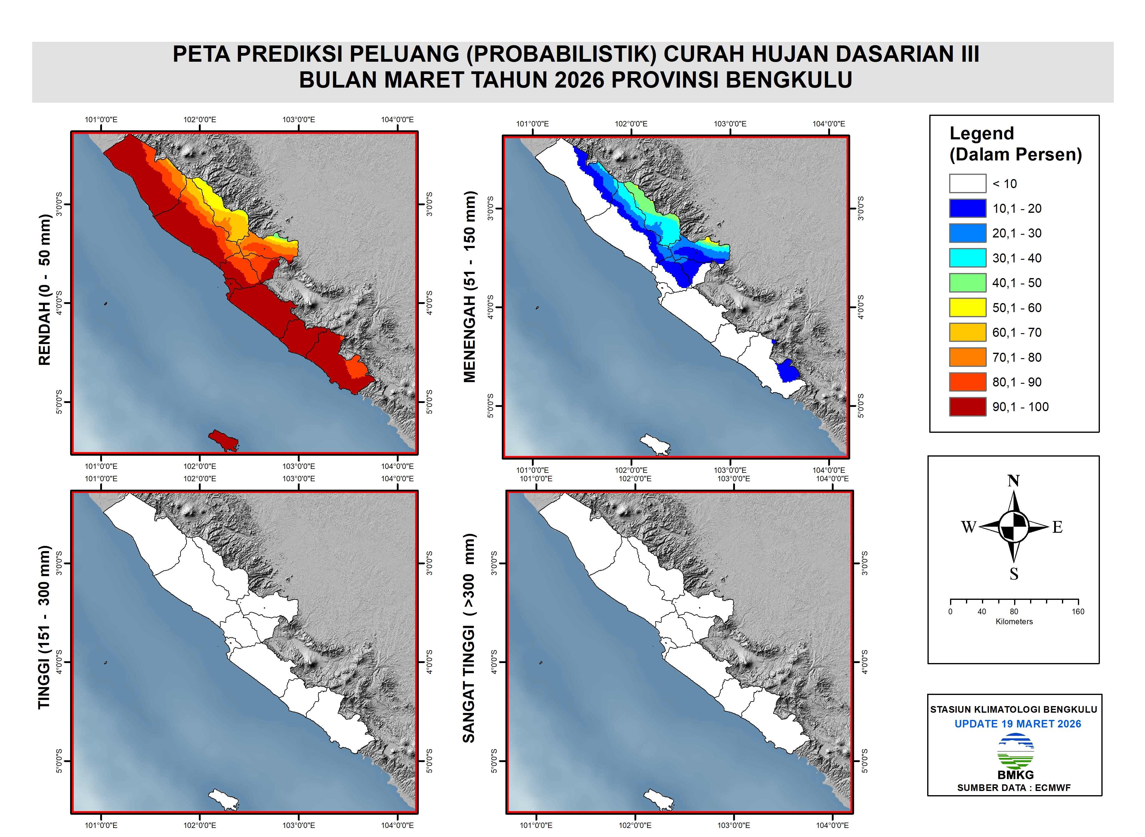 - Peluang curah hujan dasarian pada kategori sangat tinggi (>300 mm/dasarian) diprediksi memiliki peluang < 10% di seluruh wilayah Provinsi Bengkulu (nihil).